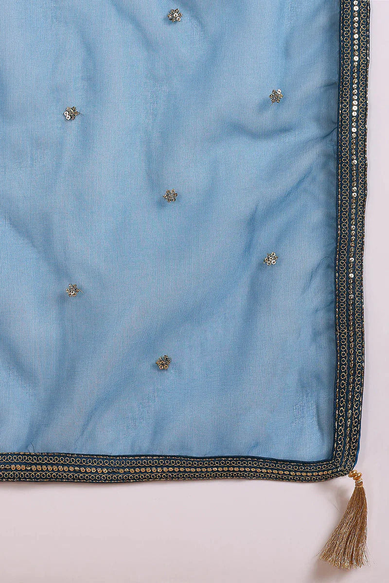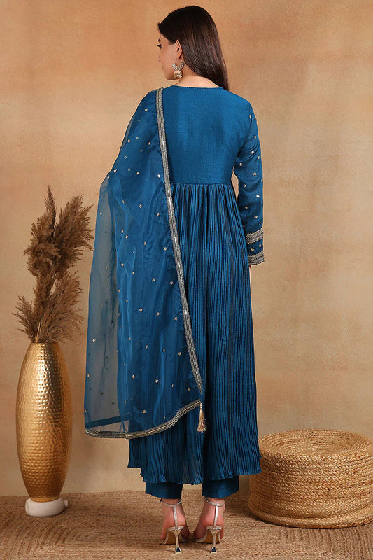 Elegant Blue Silk Blend Solid Embroidered Flared Suit Set