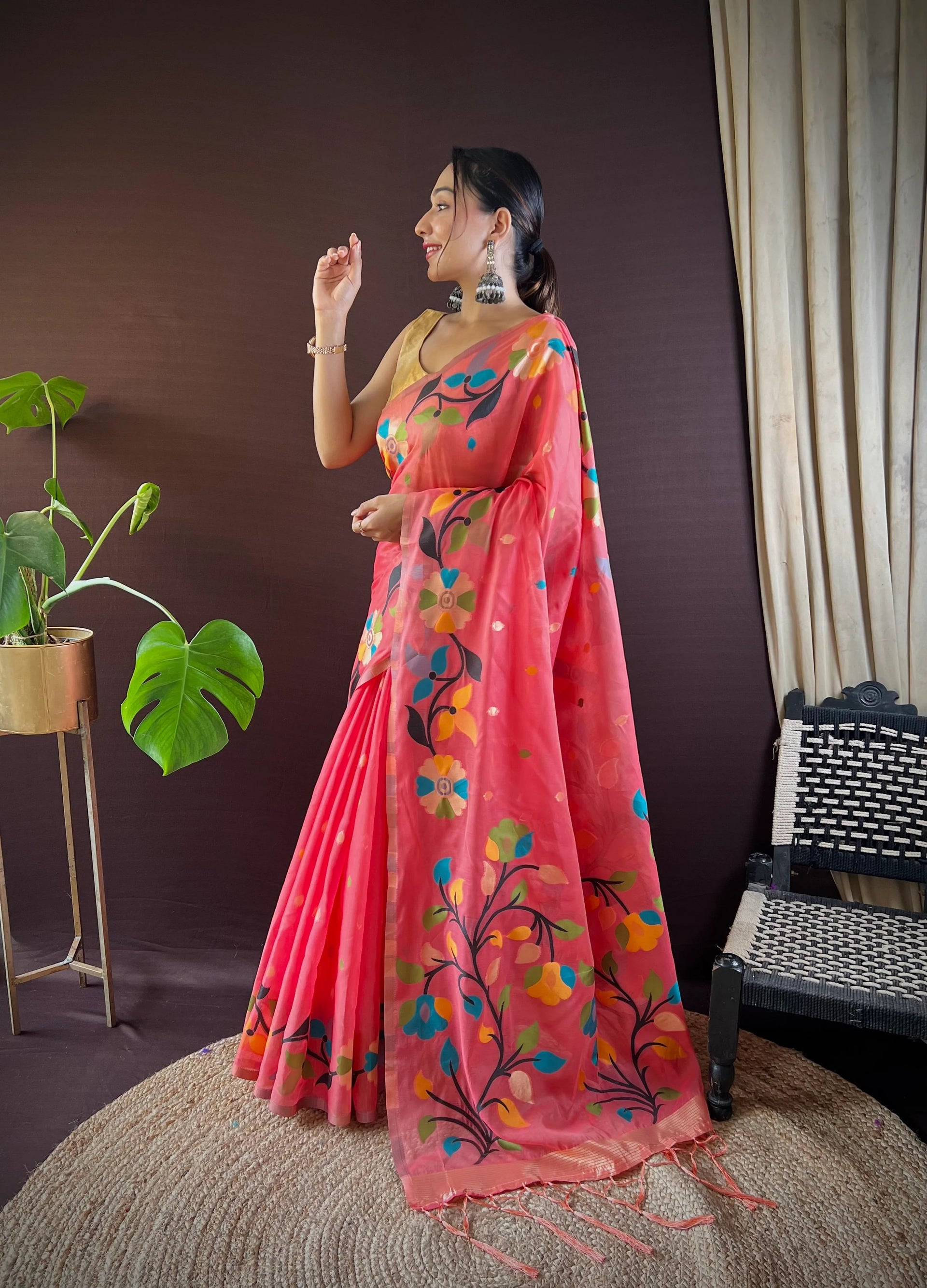 - Women Party Wear Handloom Weaving Work Soft Cotton Saree With Un Stitched Blouse (PEACH)