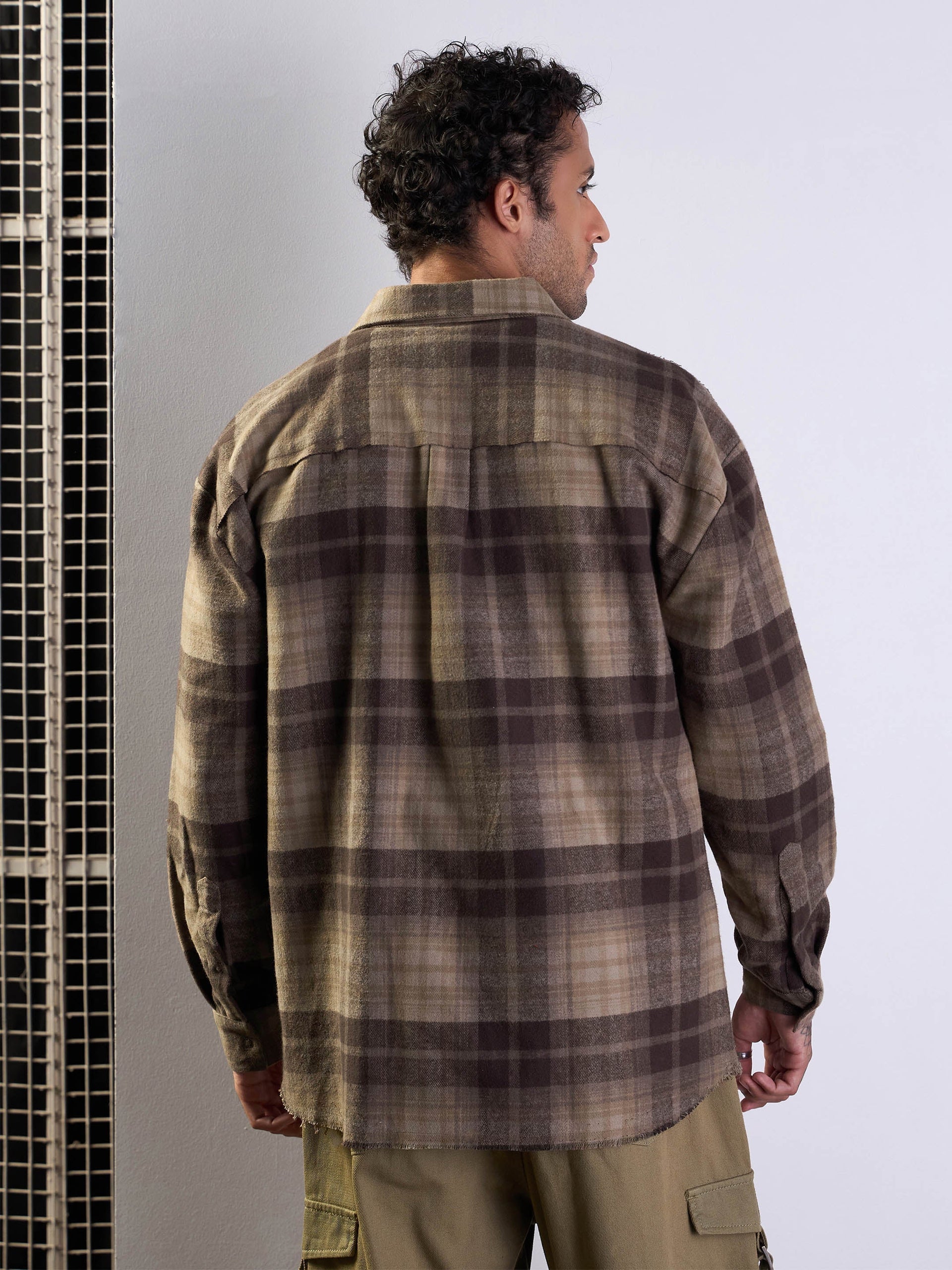 Men Beige & Brown Check Raw Edge Hem Oversize Shirt