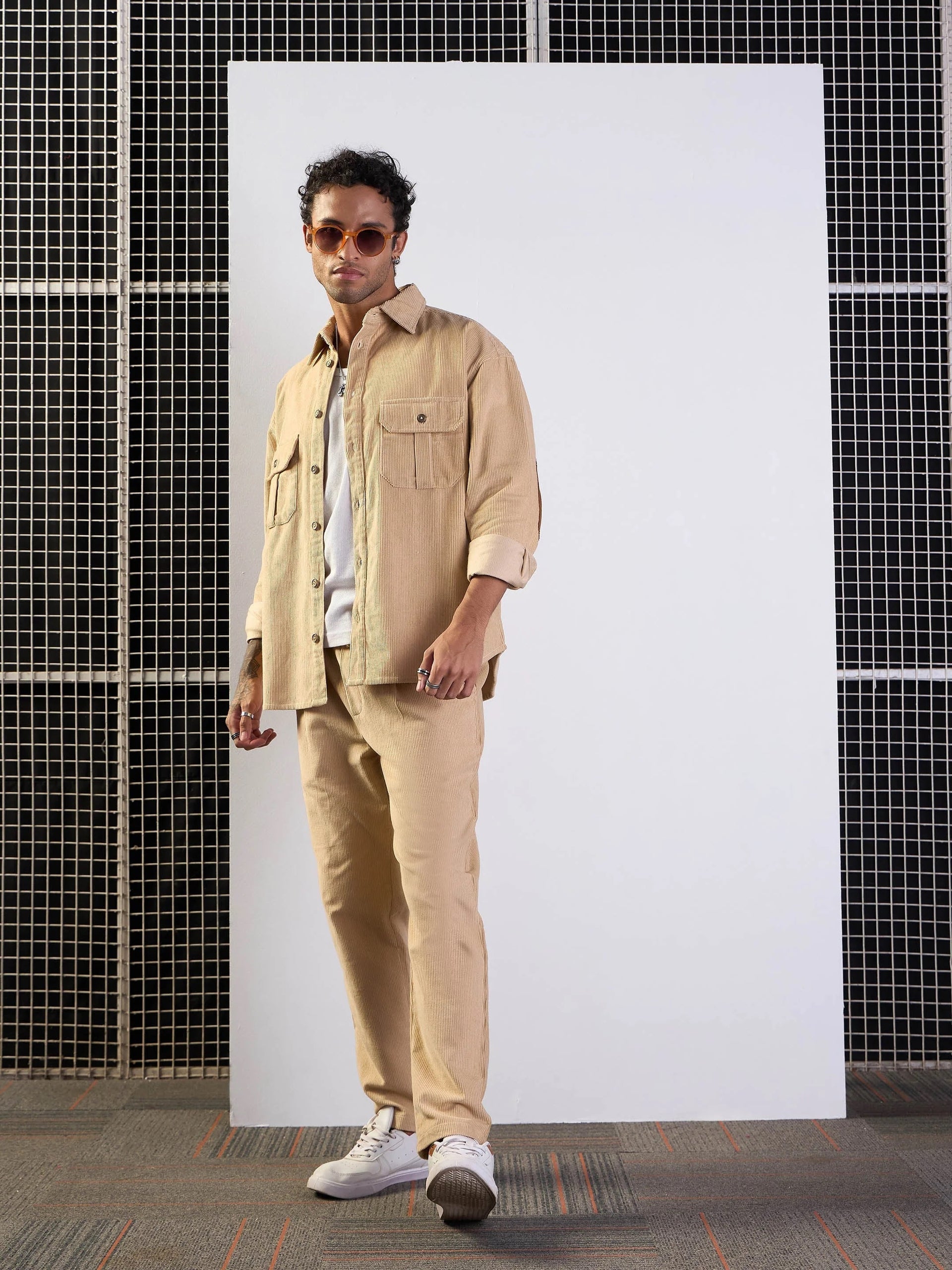 Men Beige Corduroy Elbow Patch Oversize Shirt